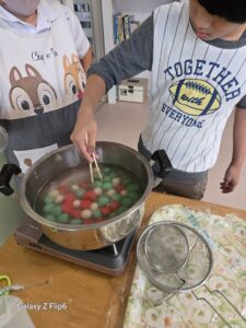 - 火傷に注意しながら、くっつかないように混ぜ混ぜしたり、楽しくお料理!