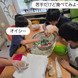 - 火傷に注意しながら、くっつかないように混ぜ混ぜしたり、楽しくお料理!